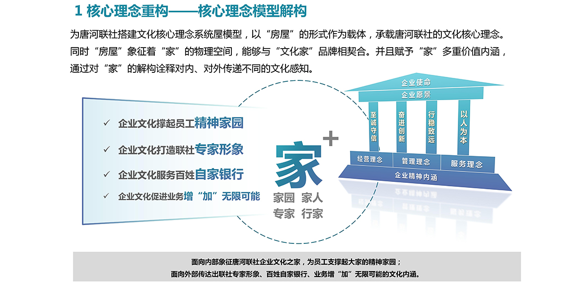 构建以 “家+” 文化为核心的理念系统,面向外部传达出唐河农商银行专家形象、百姓自家银行、业务增“加”无限可能的文化内涵。